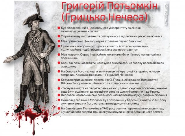Крім своїх підручників, у жителів окупованого регіону, за словами зрадниці, мають бути і свої свята. «Непогано було б зробити пам’ятними дати народження князя Олександра Потьомкіна та імператриці Катерини II, тому що ці дві знакові особи, які мали безпосереднє відношення до створення нашого краю», - заявила Кузьмич. У такому випадку і 12 червня треба вихідним зробити, адже у цей день народився ще один знатний українофоб Володимир Сальдо, хоча, якщо чесно, до Катерини II, яка, за словами Кобзаря, «доконала Вдову-сиротину» (Україну) і Грицька-Нечеси, як називали Потьомкіна козаки, йому ще далеко. Цікаво, до речі, що написано про того ж Потьомкіна у згаданому підручнику. Навряд чи, правду. А вона, як видно з інфографіки, що її підготувала Арміяіпїогт, доволі цікава.