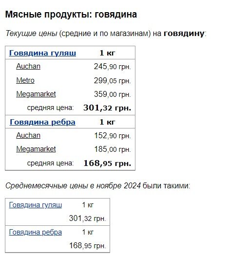 Ціни на яловичі ребра практично не змінилися, залишившись на рівні 168,95 грн/кг. Цінник коливається від 152,90 грн/кг Ашан до 185,00 грн/кг МегаМаркет.