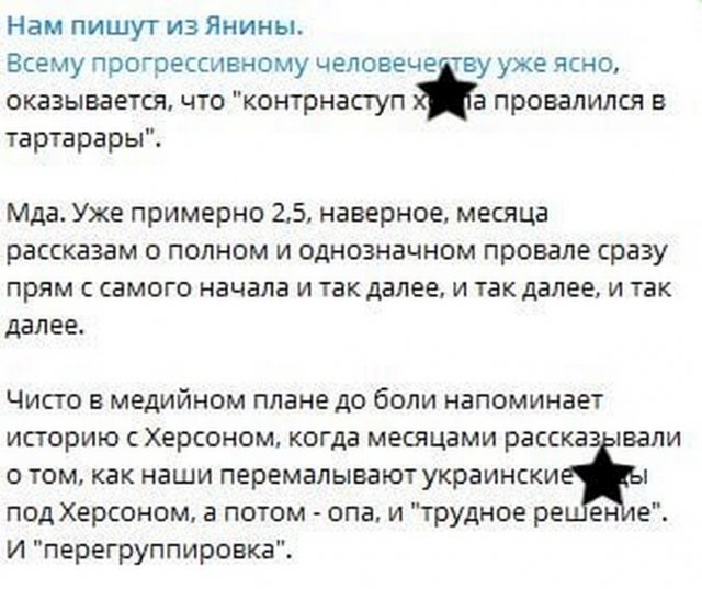 "Чисто в медийном плане до боли напоминает историю с Херсоном, когда месяцами рассказывали о том, как наши “перемалывают” украинские ор*ы под Херсоном, а потом - опа, и "трудное решение", и "перегруппировка"... Вся наша пропаганда радостно перечисляет уже много месяцев стопицот проблем, с которыми столкнется и сталкивается враг. Но никто почему-то не говорит, что, ударившись лбом даже о внезапную, даже о серьезную проблему, противник наш, хитро**пый и упорный, потирает ушибленный лобик и начнет ее решать", - написав окупант Мурз.