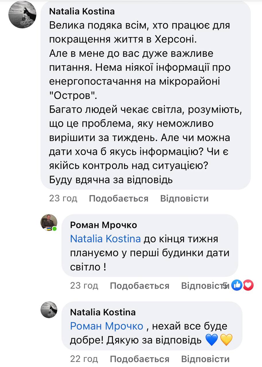 У соціальній мережі Фейсбук під постом начальника Херсонської міської військової адміністрації Романа Мрочко херсонка поставила питання, коли чекати світла на Острові.