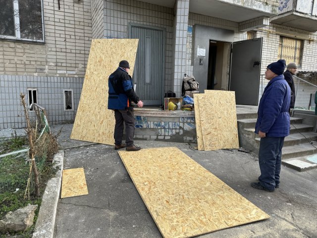 "Пошкоджені близько 40 вікон. Працюємо однією бригадою у кількості шести людей. Тут тільки вікна зашили та балкони. Дах не зачепило. Люди не постраждали", говорить бригадир ХОКАРС Олег Козаченко.Під обстрілом також була і сусідня вулиця. Пошкоджені вікна, паркани, дахи житлових будинків, розповів херсонець Павло.