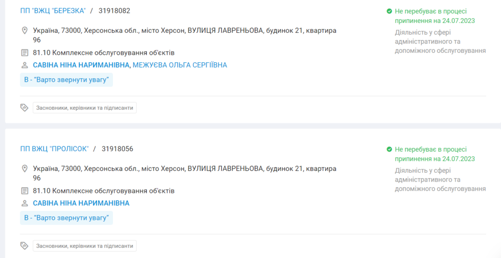 Савіна неодноразово фігурувала у корупційних скандалах у Херсоні. Вона і досі офіційно очолює кілька підприємств у місті, які так чи інакше пов’язані з утриманням житлових будинків.