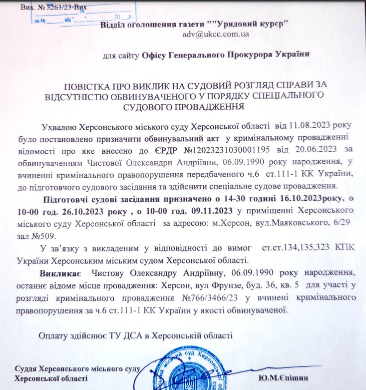 Чистова має прийти до херсонського суду 16 жовтня, 26 жовтня та 9 листопада.