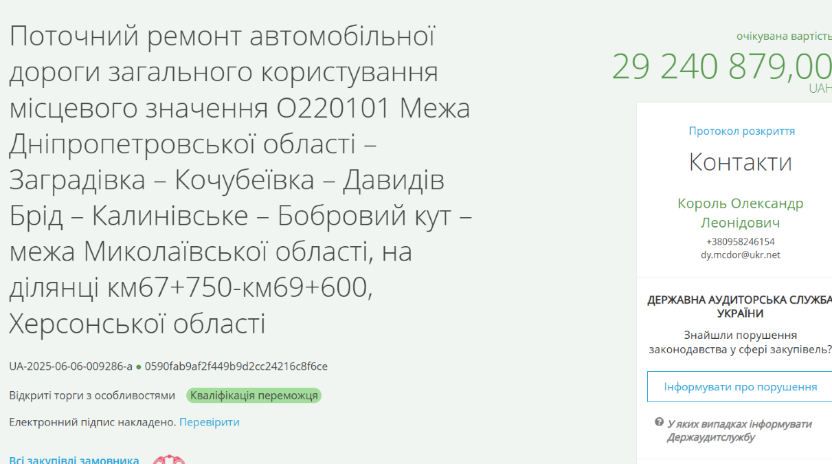 Також на Херсонщині фірма зі сумнівною репутацією знову отримала великий контракт на ремонт доріг — цього разу на понад 400 мільйонів гривень. Це вже другий тендер за рік, де вона виступала єдиним учасником і автоматично стала переможцем.
