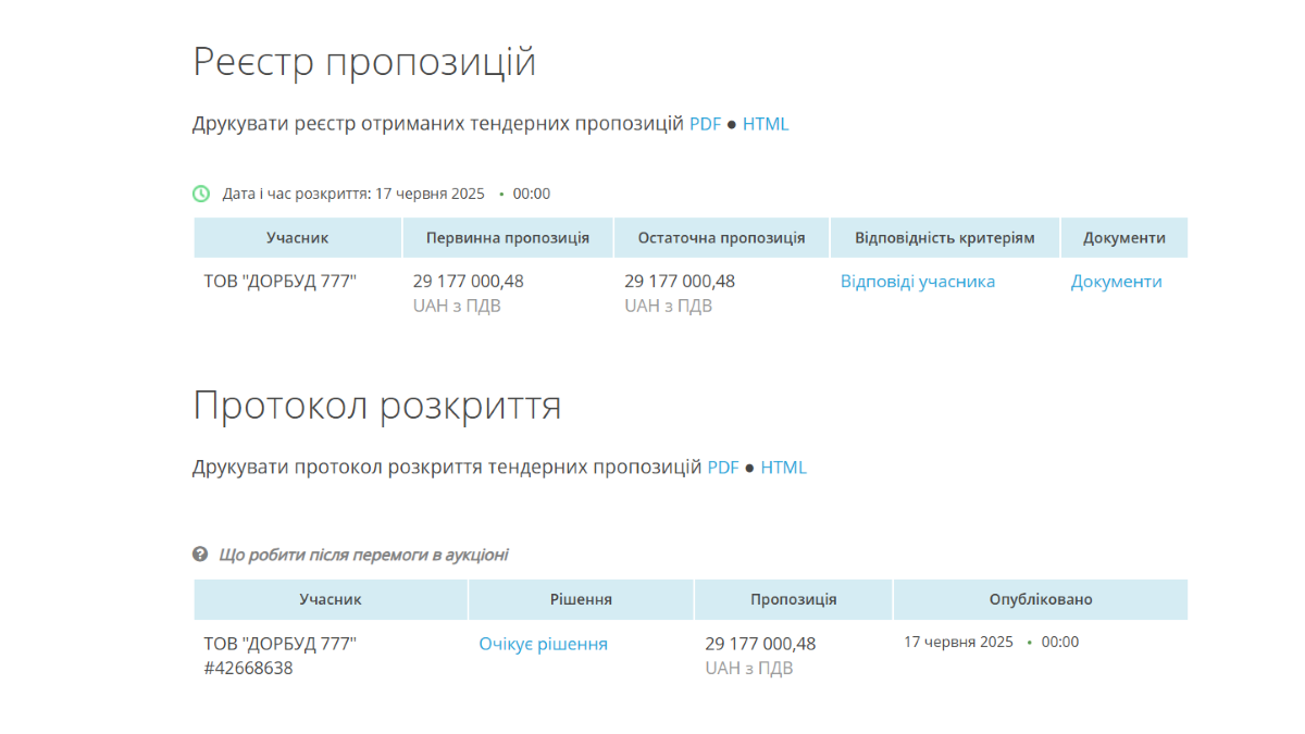 Скриншот: ProzorroПроведення аукціону запланували на 17 червня, але свою пропозицію надало лише одно товариство, яке наразі очікує рішення щодо підписання угоди. Сума, за яку компанія готова узятися до роботи, знижена на понад 63 тисячі гривень, хоч розмір мінімального кроку пониження ціни становить 292 408 гривень. Тож майже 30 мільйонів на ремонті дороги Херсонщини може отримати товариство “Дорбут 777”.