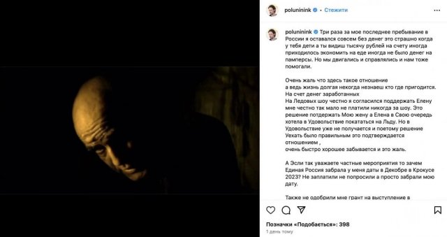 Полунін обурився таким ставленням країни до нього, адже він свого часу підтримав окупантів та вихваляв Путіна. Через підтримку війна йому заборонили виступати в США і Європі і його "єдиним хлібом" залишилась російська сцена, якої його також позбавили.