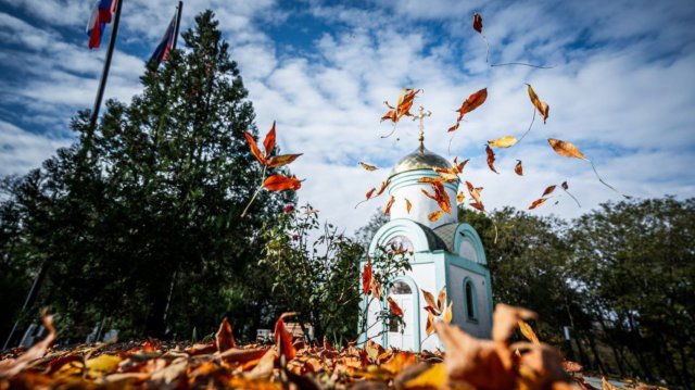 У парку культури і відпочинку ім. Т.Г. Шевченка, де окупанти прорідили деревну рослинність для свого «многофункционального центра» та літньої сцени для пропагандистських концертів, з каштанів і ясенів, які залишились, облітає листя. Під ясним жовтневим небом красиво виглядає капличка, яку там побудували ще до окупації.