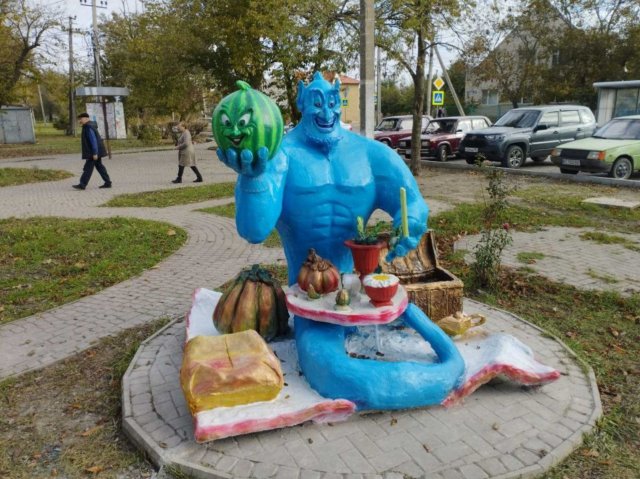 Безлюдно і на генічеських пляжах. Наприклад на Кам’яному біля районної лікарні, де раніше цієї пори прогулювались бабусі, аби подихати цілющим морським повітрям, і собаки, яких на повідках вигулювали їх власники, тепер блакитними морем і небом любуватись майже нікому.А на перехресті вулиці Гоголя і проспекту Миру з’явилось голубе страхіття у вигляді пам’ятника. На спині потвори написано, що воно є Джином з диснеївського мультфільму «Аладін», але «джин» чомусь більше схожий на нетверезого Сальдо. До речі, деякі місцеві колаборанти, які на догоду господарям виступають за «духовні скрепи» і «православні цінності», вже побачили у потворі «образу почуттів віруючих». Мовляв, те, що в інших культурах називається «джинами», і православ’ї зветься «чортами». А пам’ятника чортові у середмісті бути не може, запевняють. Хоча подивимось, що вони зможуть з ним зробити, коли на спині замість «Джин» дійсно напишуть «Сальдо».