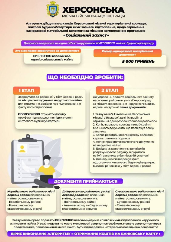 17 червня влада оприлюднила алгоритм дій для отримання одноразової допомоги в 5 тисяч гривень від Херсонської міської військової адміністрації херсонцями, чиє житло постраждало внаслідок підриву росіянами дамби Каховської ГЕС.Ось що зазначено в алгоритмі:
