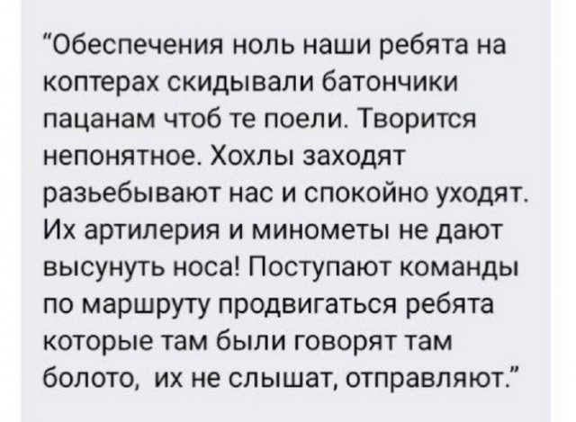 У свою чергу інший Z-воєнкор Романов писав, що командування не евакуює особовий склад і не постачає їх навіть водою та їжею, через що окупанти змушені їсти мишей.