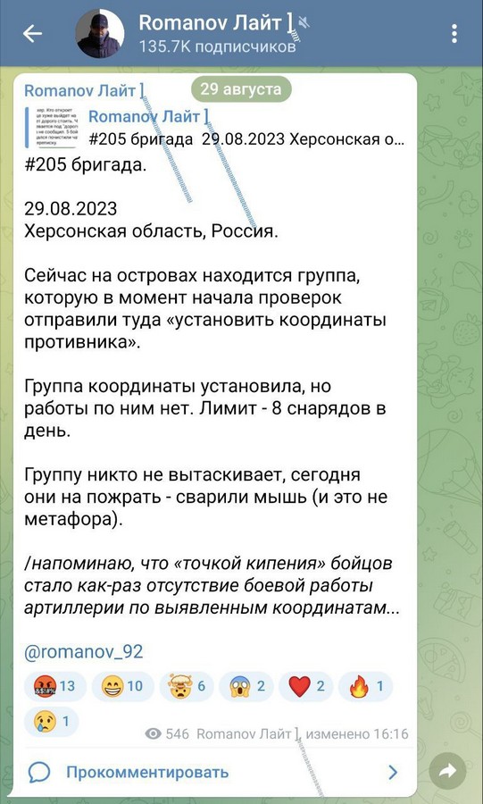 Нагадаємо, що першим про проблему 205-ї бригади повідомляв ще 24 серпня у своєму блозі російський військовослужбовець Єгор Гузенко «Тринадцятий».
