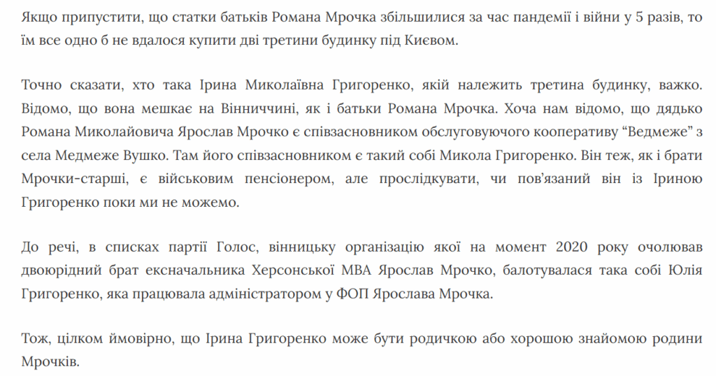Журналісти спираючись на дані декларацій Романа Мрочка та інформацію з інших відкритих джерел припустили, що батькам не вдалось би придбати такий будинок коштом офіційних доходів посадовця. Хто така Ірина Григоренко, журналісти також не з’ясовували, але зазначають, що «не менш очевидно, що п’ятисотметровий палац купив сам Роман Мрочко, записавши його на батьків та третю особу».