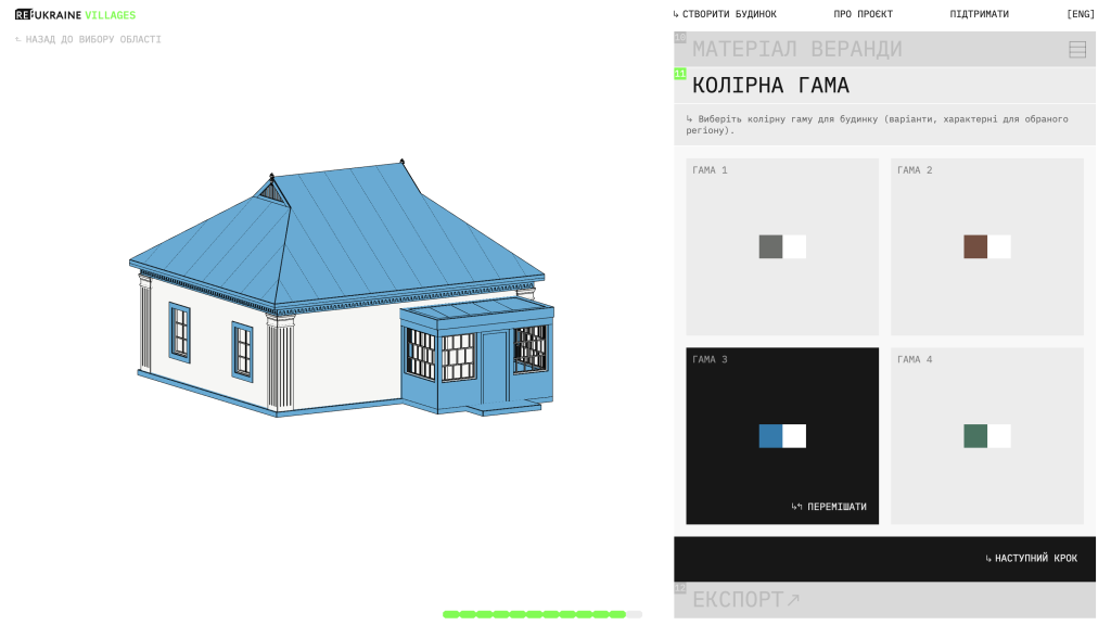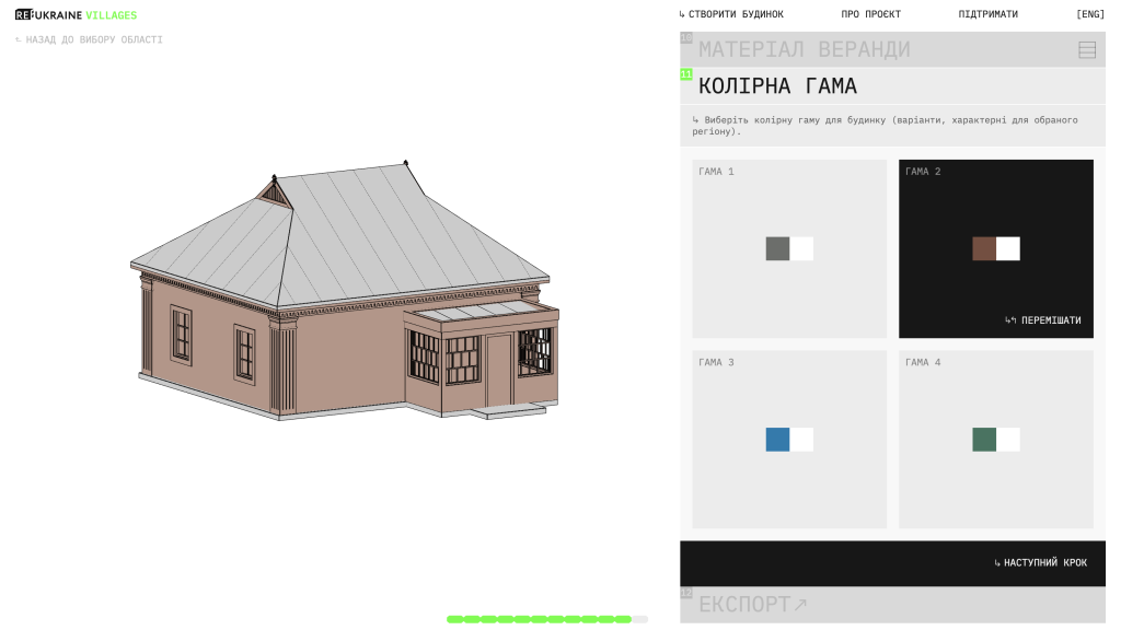 В онлайн-конструкторі RE:Ukraine Villages можна створити віртуальний будинок за дизайн-кодом конкретного регіону, а також отримати рекомендації з будівництва або відновлення такого житла.