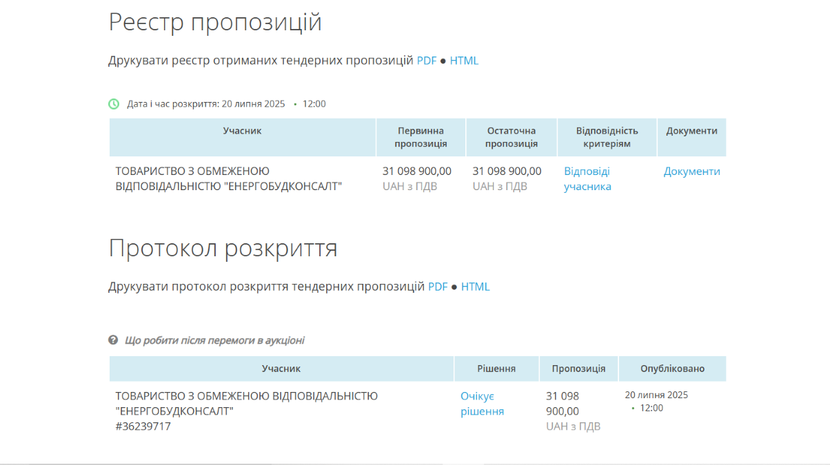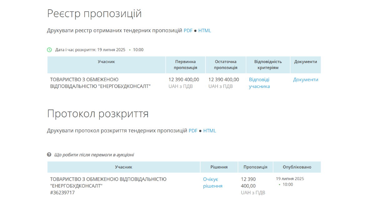 Найдорожчий із них — ремонт котла №2 ПТВМ-50 на котельні по вулиці Івана Богуна, 95 — коштуватиме орієнтовно 31,1 мільйона гривень. Другий тендер стосується капремонту котла №3 КВГМ-30 на котельні по вулиці Василя Великого, 36, і передбачає витрати у 12,4 мільйона гривень.Обидва тендери стартували 19 липня, але участь у них взяла лише одна компанія з Києва — ТОВ "Енергобудконсалт". У першому тендері фірма знизила ціну всього на 50 тисяч гривень, хоча мінімальний крок аукціону мав становити понад 155 тисяч. У другому — ситуація аналогічна: замість щонайменше 373 тисяч гривень пропозицію зменшили трохи більше ніж на 50 тисяч.