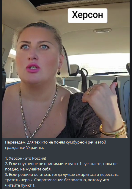 Пропагандисти одразу ж розтягнули цей короткий спіч по безлічі пабліків і Telegram-каналів, заявляючи, що жінка на відео нібито живе в Херсоні й чекає на повернення російських окупантів, а всім, хто не поділяє її поглядів – пропонує тікати з міста.