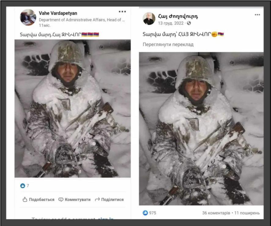 Джерела, з яких могла бути взята світлина, належать вірменським ресурсам, які підписують його як вірменського солдата. Однак переважно це сторінки-сміттярки, які є проросійськими та поширюють пропагандистські меседжі, розганяють паніку тощо.