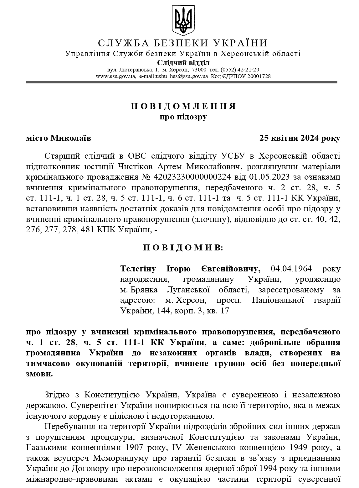 З’явилася друга заочна підозра для 60-річного колаборанта з Херсона Ігоря Телегіна. Цього разу СБУ звинувачує його в добровільному обранні до незаконних органів влади, створених на тимчасово окупованих територіях.
