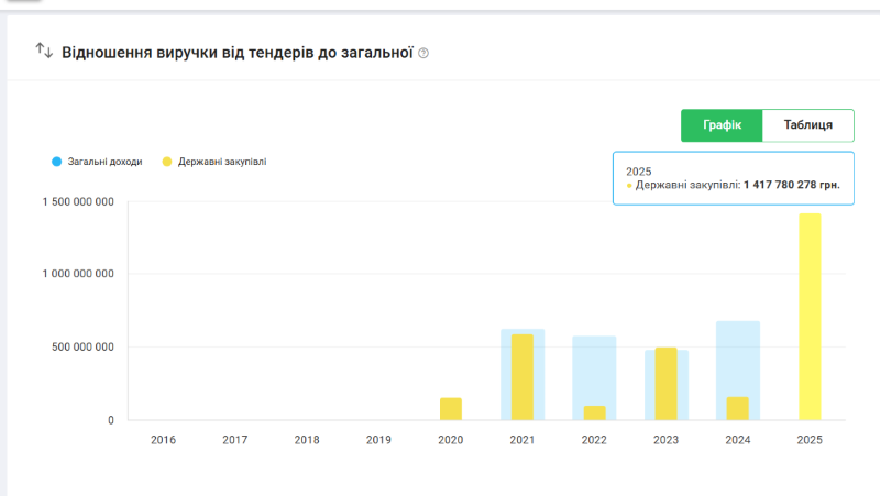 Попри сумнівну репутацію, компанія продовжує вигравати державні тендери. Загальна сума підрядів, отриманих із держбюджету, вже перевищила 2,9 мільярда гривень. Серед замовників — місцеві адміністрації, комунальні установи, Служба відновлення Одеської області й Місцеві дороги Херсонщини. Найбільше компанія заробила на тендерах у 2025 році — понад 1,4 мільярда гривень.