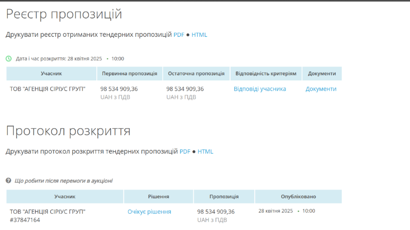 На торги подалася лише одна компанія — "Агенція сіріус груп". Її пропозиція була на 1,8 млн гривень нижчою за очікувану суму. Наразі фірма очікує підписання договору.