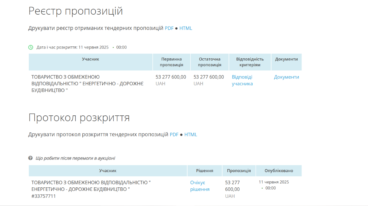 Пропозиції від учасників приймали до 11 червня, і на цей же день було заплановано аукціони. У двох закупівлях — на 12,6 та 28,9 мільйона гривень — змагались компанії "Автомагістраль-Південь" і "Енергетично-дорожнє будівництво".