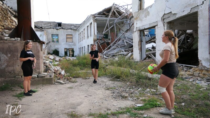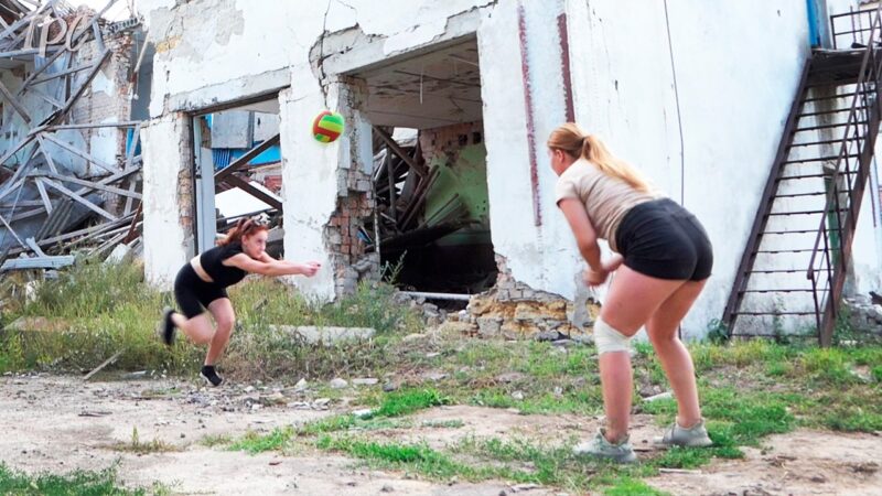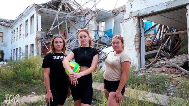 Спорт по-херсонськи… Шкільна волейбольна команда тренується на фоні їхнього знищеного внаслідок російських обстрілів спортзалу. Херсонщина, Бериславський район.