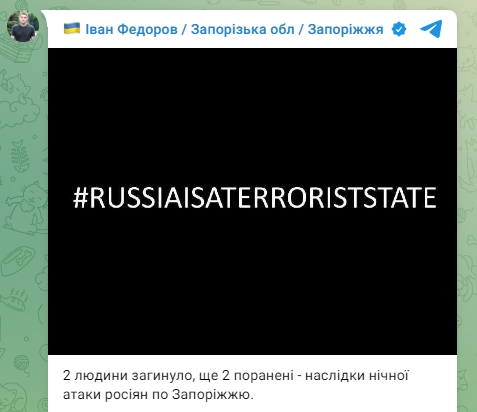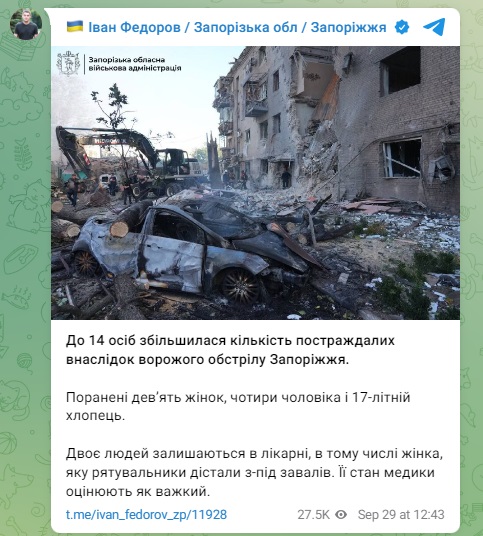 Іван Федоров повідомляє, що в готелі загинули не військовослужбовці, а жінка і восьмирічний хлопчик. 3 вересня 2024 року. Фото: t.me/ivan_fedorov_zp