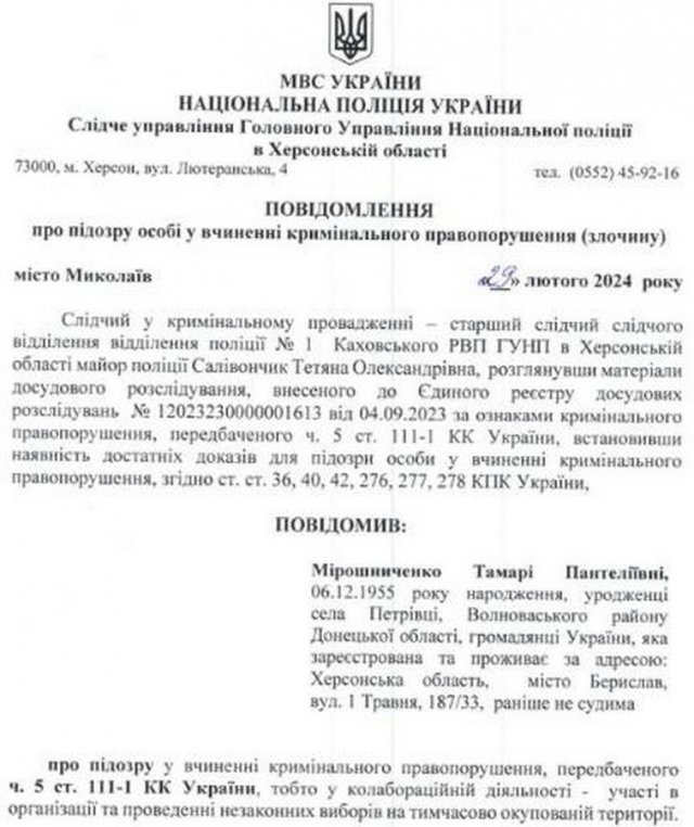 Голові незаконної територіальної виборчої комісії у Горностаївці на ТОТ Херсонщини Тамарі Мірошниченко повідомлено про підозруНа посаді вона організувала підготовку та проведення незаконних місцевих виборів. Розміщувала агітацію, забезпечувала набір людей до 6 дільничних виборчих комісій свого округу та контролювала їх роботу.