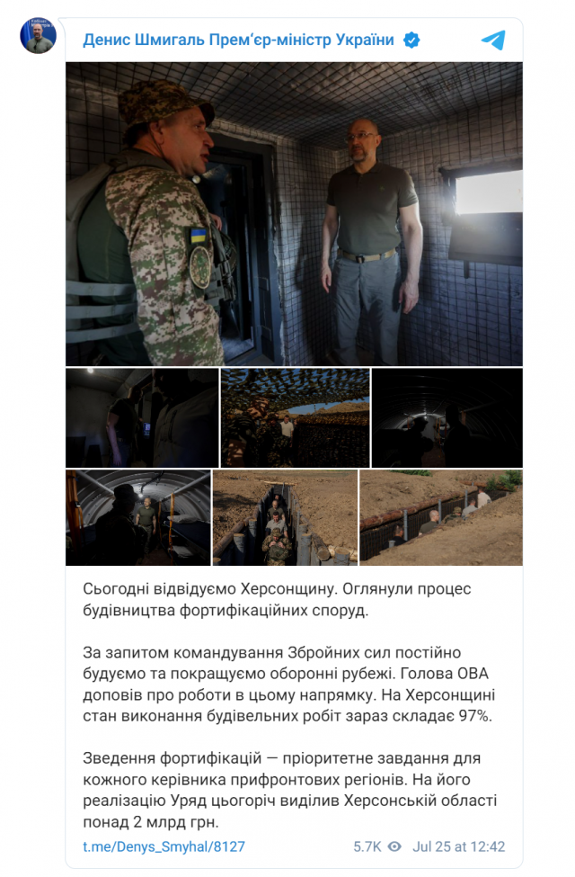 Шмигаль додав, що зведення фортифікацій є пріоритетним завданням для кожного керівника прифронтових регіонів. Глава уряду нагадав, що на його реалізацію Кабмін цьогоріч виділив Херсонській області понад 2 млрд грн.