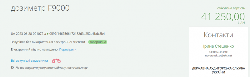 Першою п’ять дозиметрів F900 ще 28 червня 2023 року придбала Новорайська громада. Вартість закупівлі склала 41 250 гривень, тобто, приблизно по 8 тисяч гривень за штуку. Ця ціна співпадає з ринковою. Поставляти прилади для вимірювання радіації буде приватне підприємство “БРОМ”, що знаходиться у Київській області.