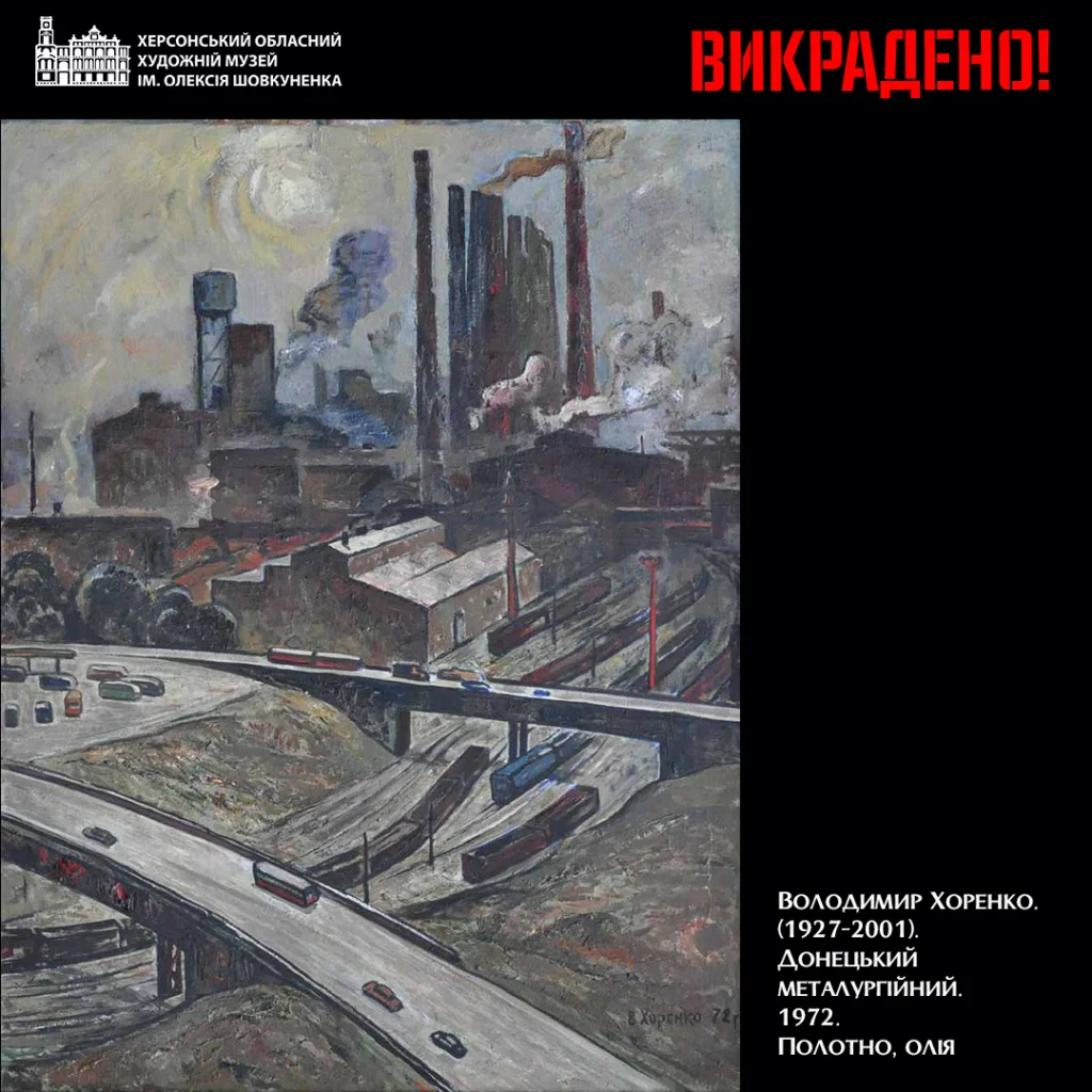 Мистецтвознавці ідентифікували ще одну роботу з колекції Херсонського художнього музею імені Олексія Шовкуненка на світлинах із кримського Центрального музею Тавриди, зроблених у березні 2026 року. Мова йде про полотно Володимира Хоренка «Донецький металургійний» (1972 рік, полотно, олія).