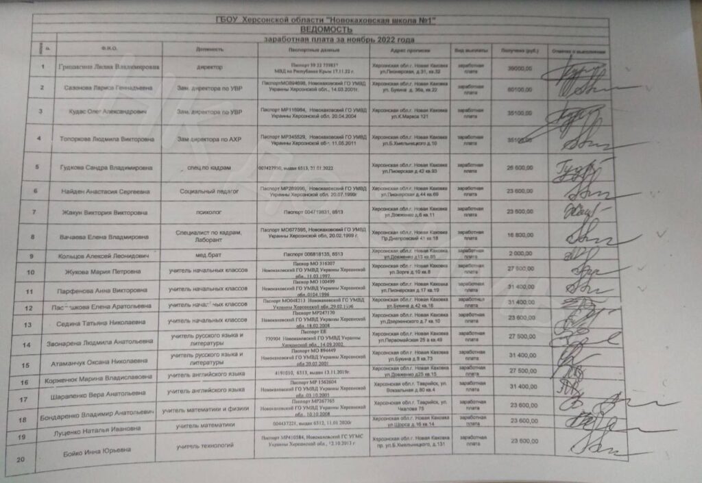 Зарплатна відомість працівників окупаційної “Новокаховской школы №1” за листопад 2022 року. Фото з тг-каналівІрина Дубас: Окупанти їм обіцяли платити добряче. Але по факту виявилося інакше. В інтернеті викладали відомості з їхніми зарплатами. З них виходило, що Лілії Гришагіній платили 38 тисяч рублів на місяць. Це неабияка зарплата для директора – це ж навіть 18 тисяч гривень немає. Якби ж вона працювала директором українського навчального закладу, то отримувала б значно більше і була б спокійна за своє майбутнє.