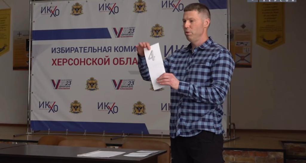 Колаборант В’ячеслав Рєзніков допомагав окупантам проводити “вибори” на Херсонщині у вересні 2023 року. Скріншот відео з соцмережПотім Рєзніков ще раз приїжджав до нашого ліцею з трьома озброєними військовими і в супроводі шести місцевих чоловіків, переважно, колишніх сторожів, яких свого часу звільнили за пиятику. Серед них був Осипенко Павло Сергійович, відомий місцевий «співак», який працював у палаці культури та інших закладах. З ними була Людмила Топоркова, яку Рєзніков представив своїм заступником з господарчої частини. В очі мені він не дивився. Сказав, щоб я передала всі приміщення ліцею разом з усім майном Топорковій.