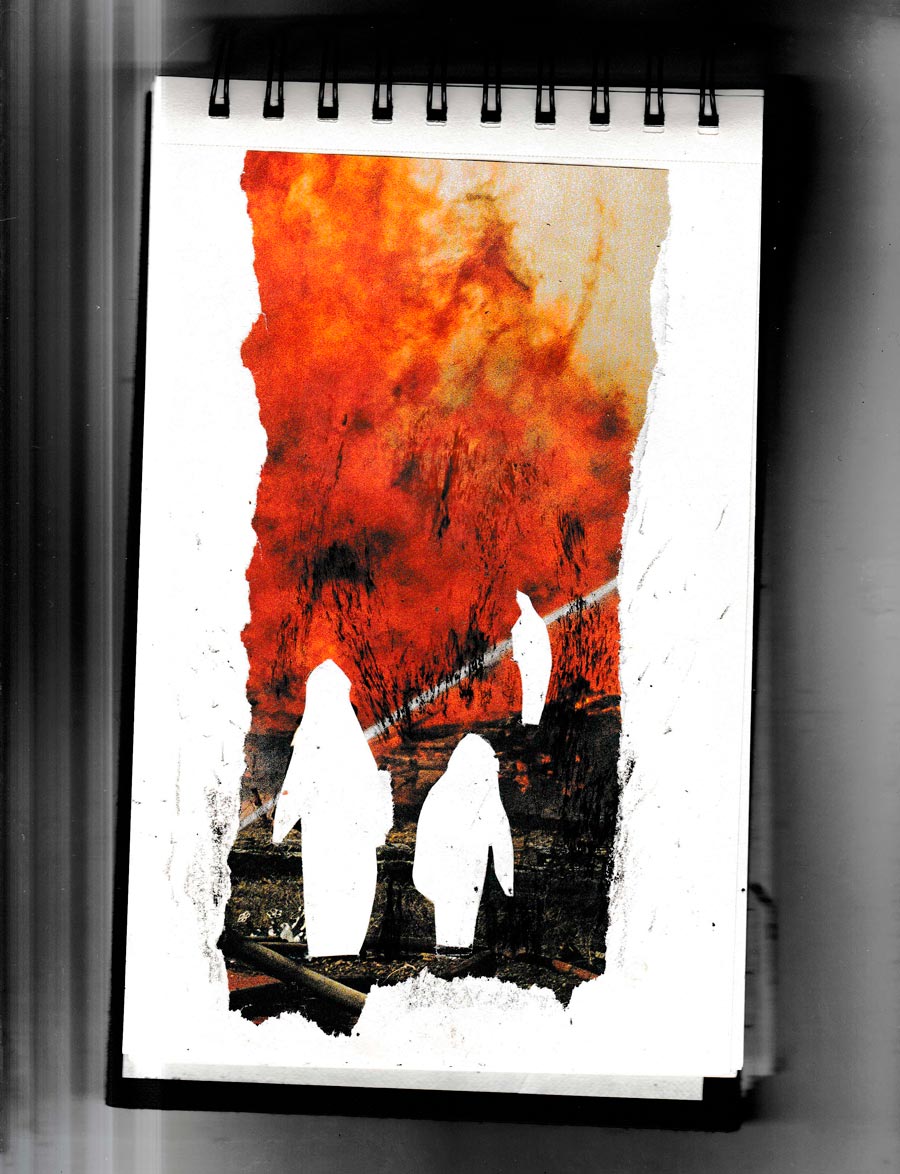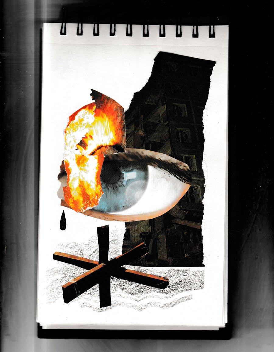 Я вже давно веду такий собі мистецький щоденник, де роблю невеличкі колажі. Вчора мені приснилося, що я бачила багато вогню.... Все горіло так само, як горіла моя батьківщина всі ці 6 місяців. І на моїх колажах теж було багато вогню... Ці нові колажі я робила плачучи... У них багато сенсу... У них стільки болю... Вони справжні... Важко зрозуміти, що це реальність... Але я проживаю свої емоції в роботах і стає легше... Я назвала цей художній щоденник "Чорна книга". (фрагмент листування від 15.08.2022)