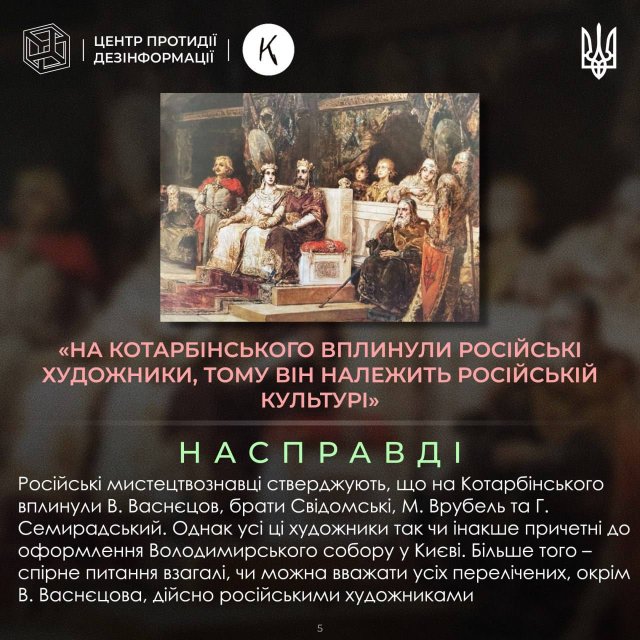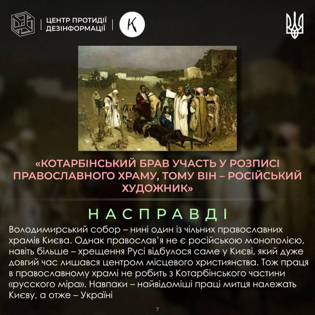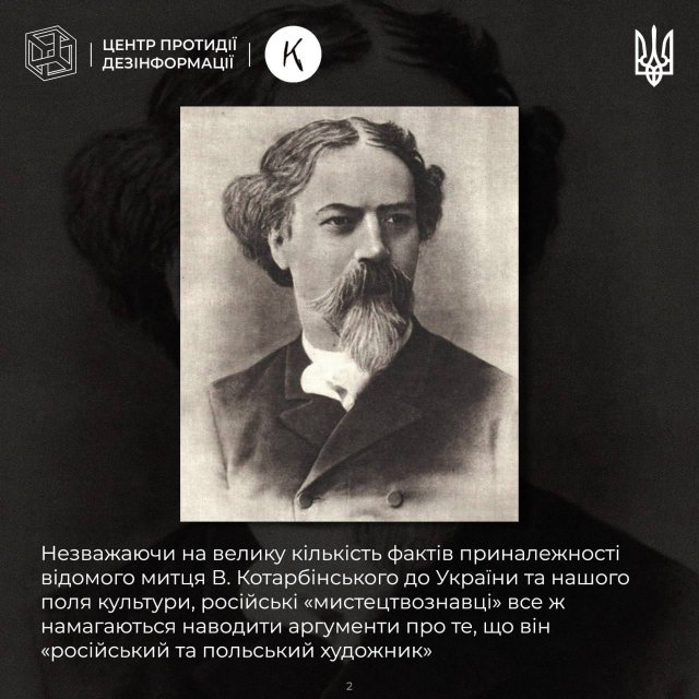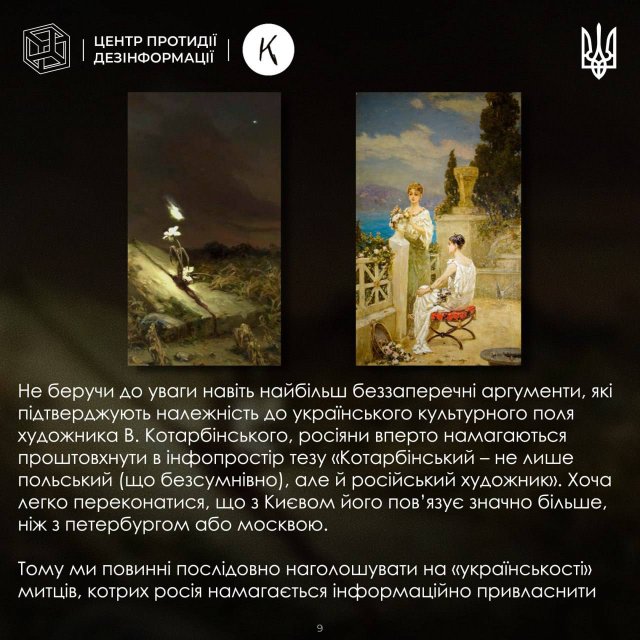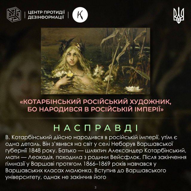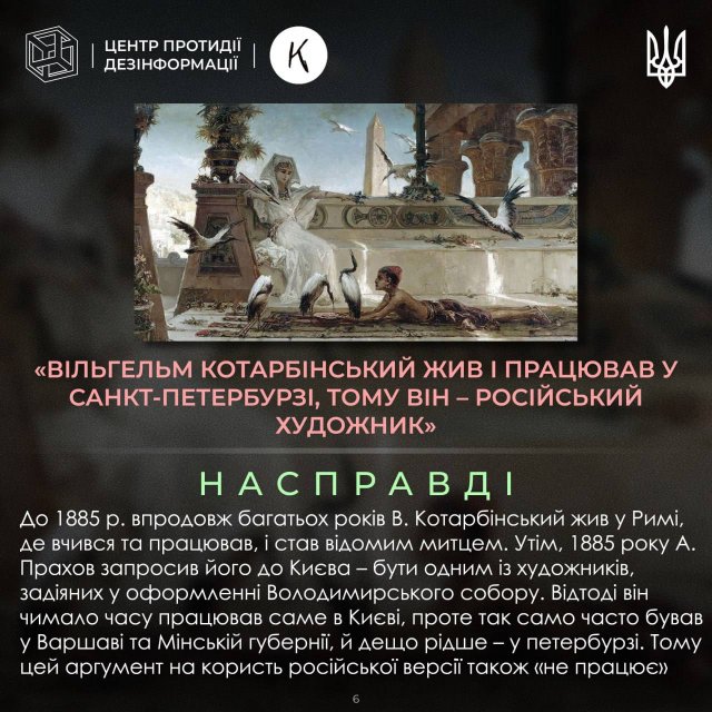 Тож до зображення викраденого окупантами полотна Вільгельма Котарбінського, що є фактом фізичного пограбування, додаємо інфографіку, яку створили Центр протидії дезінформації та YouTube-канал Культуртригер — про фейки, які просуває роспропаганда в намаганні привласнити Вільгельма Котарбінського інформаційно", - вказується у публікації музею.