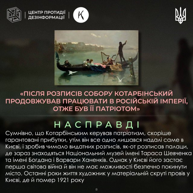 До речі, передостанній слайд містить зображення написаної в 1881 році картини Котарбінського «Гондола» («Венеційська серенада»), варіант якої був викрадений росіянами з Херсонського художнього музею. Де зараз перебуває шедевр — невідомо.