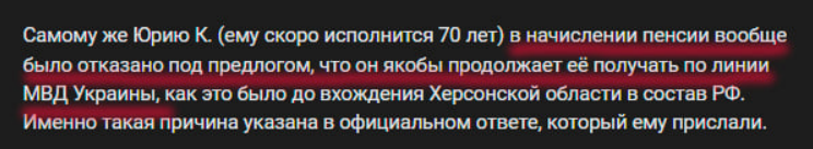 Ось тільки, як це зазвичай буває в Росії, більшість сказаного пропагандою виявляється брехнею. Держава-агресор затримує виплати за так званими «житловими сертифікатами» для херсонців, повідомляють російські ЗМІ. У деяких регіонах РФ фінансування програм для переселенців призупинили взагалі. За таких умов росіяни відмовляються продавати житло «евакуйованим» та погрожують судитись за вже продану нерухомість.З пенсіями ситуація схожа. Наприклад, на початку липня в ефірі радіо «Комсомольська правда « херсонський лікар-колаборант Віктор Бурдовицін відкрито звинуватив росіян у брехні. Бурдовіцин за окупації очолював Херсонську обласну дитячу лікарню та у жовтні 2022 втік до Московської області. Зараз він отримує від Росії мінімальну пенсію, якої ледь вистачає, щоб вижити. «Мене направили у Генічеськ. Я написав туди листа. Мені відповіли, що немає в РФ закону щодо індексації виплат для пенсіонерів з Херсонщини. Зараз отримую мінімальну пенсію». Ця історія не є унікальною: до прикладу, ветеранам українських силових структур росіяни пенсію відмовляються платити взагалі.