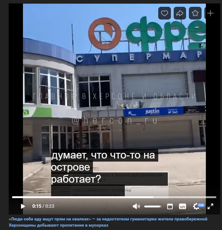 «Люди шукають собі їжу на смітниках, адже після повені багато магазинів закрились. Жоден з продуктових не працює», – описують росіяни ситуацію в Херсоні. За їх словами, деякі мікрорайони міста після підтоплення опинились на межі гуманітарної катастрофи. Українська влада бездіяльна, а на Херсон очікує голодний бунт.Як доказ наводиться відео із зачиненим супермаркетом «Фреш» у херсонському мікрорайоні Острів. Ось тільки на час повені він вже не працював, адже росіяни спочатку пограбували його, а потім розгепали своєю артилерією. Та й підвезення товарів до магазинів на Острові ускладнено тим, що цей мікрорайон знаходиться лише за кілька кілометрів від позицій росіян.