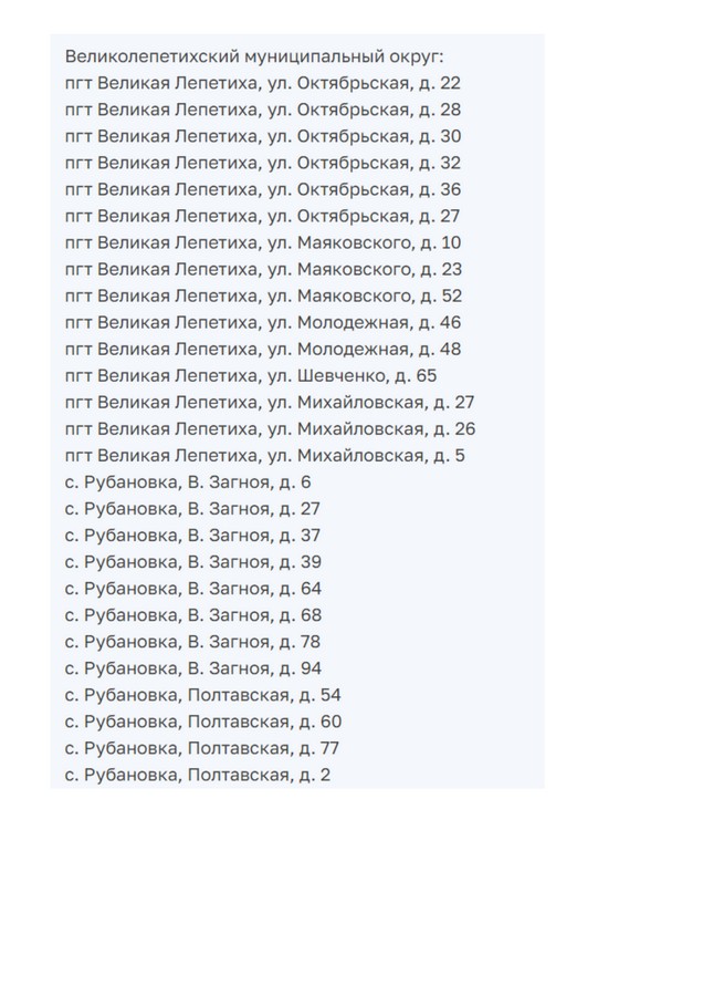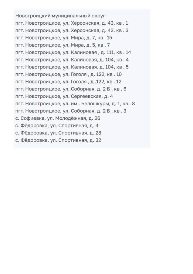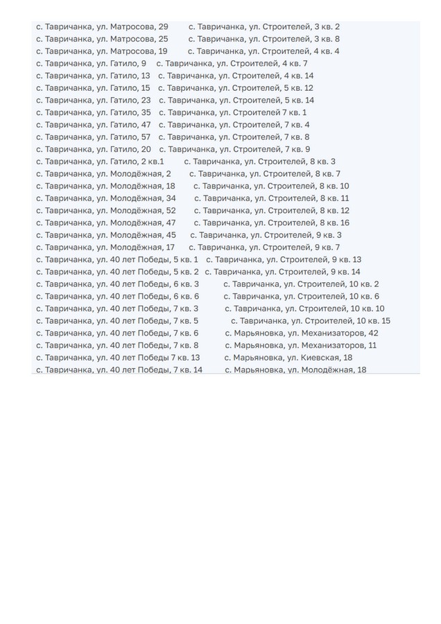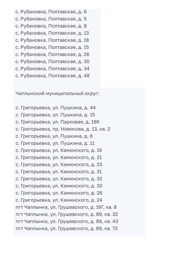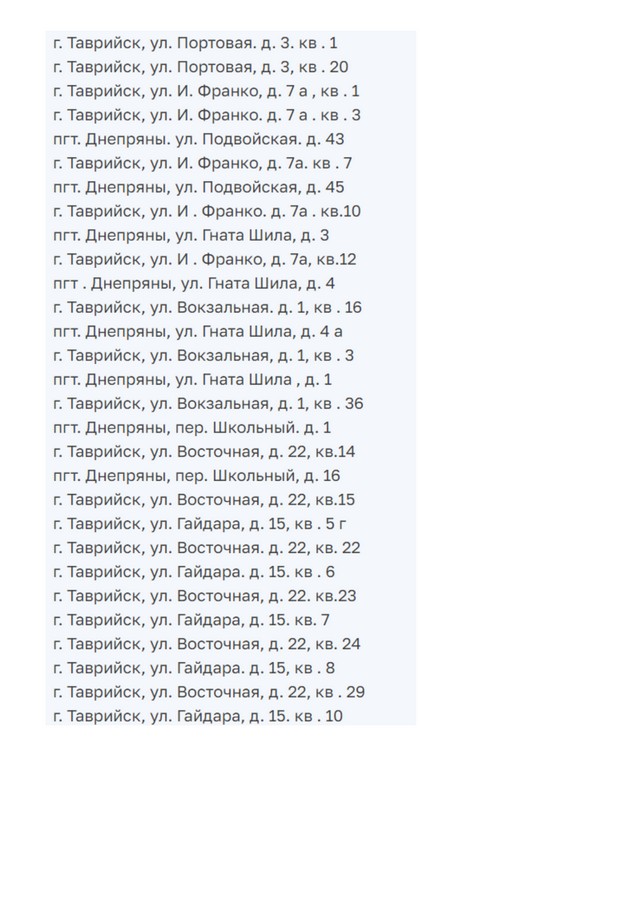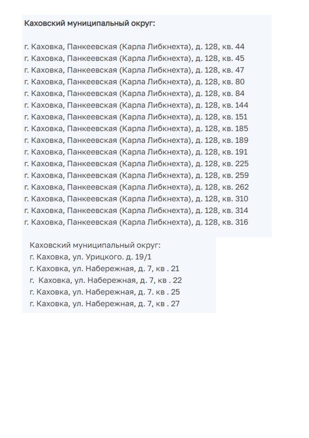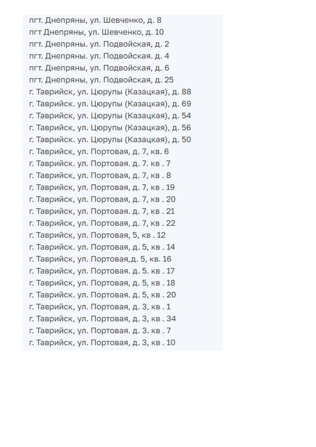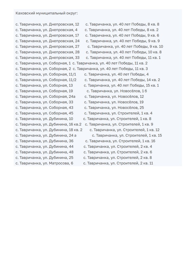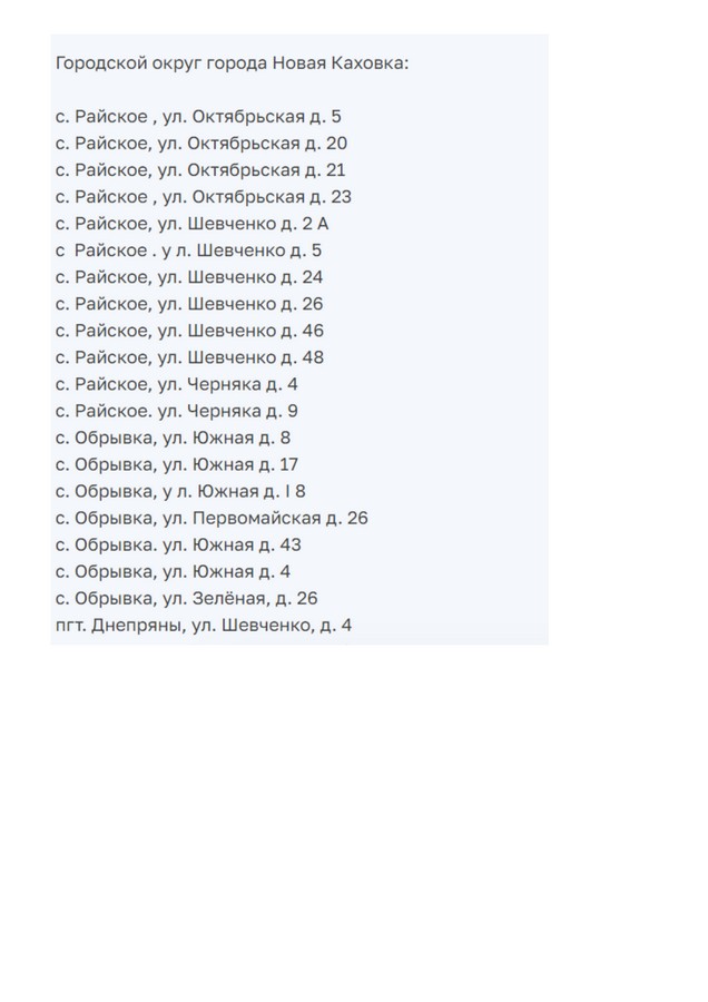 У списках вказані адреси в населених пунктах Каховського району: м. Таврійськ, селищах Дніпряни і Райське, селі Обривка Новокаховської громади, с. Ольгине Горностаївської громади, селищі Велика Лепетиха, с. Рубанівка, с. Григорівка Присиваської громади, селищі Чаплинка, м. Каховка, с. Тавричанка однойменної громади, селищі Верхній Рогачик.