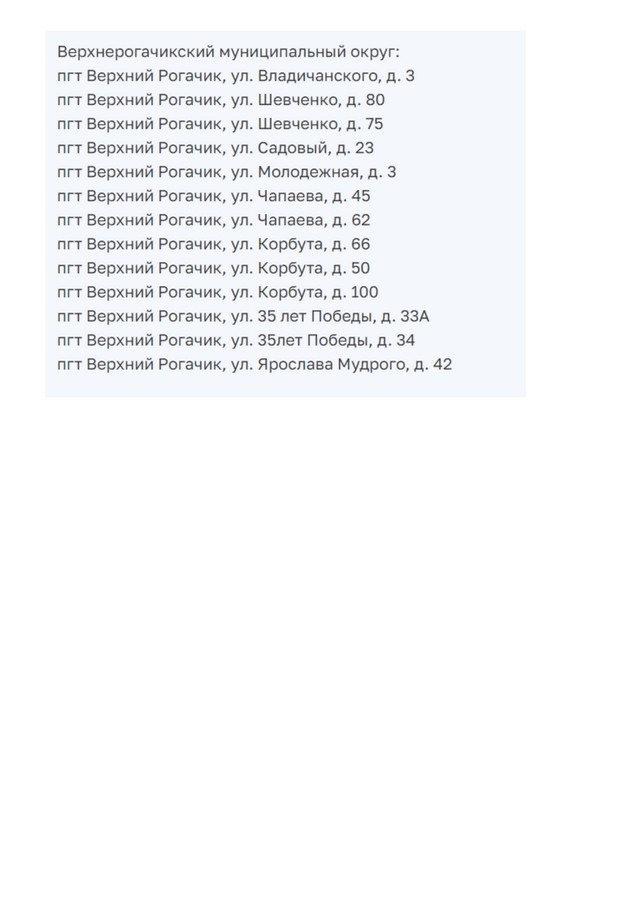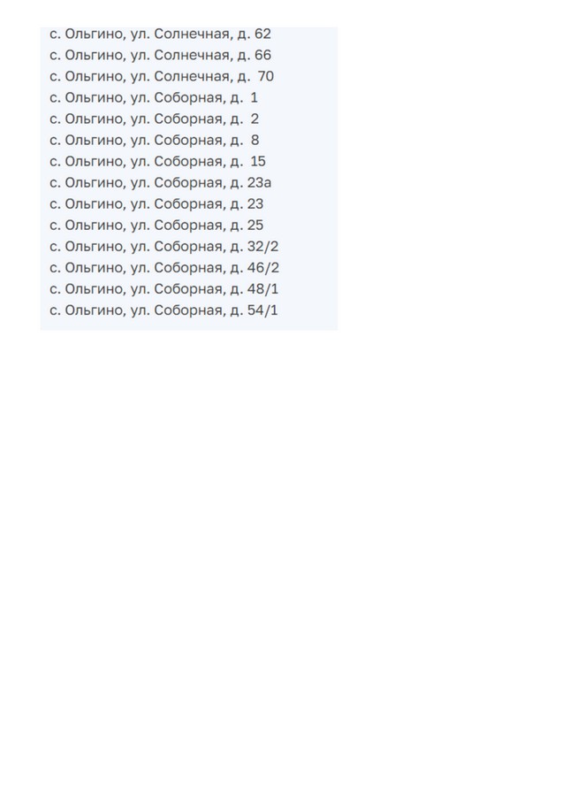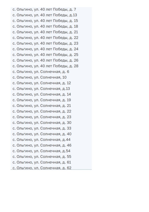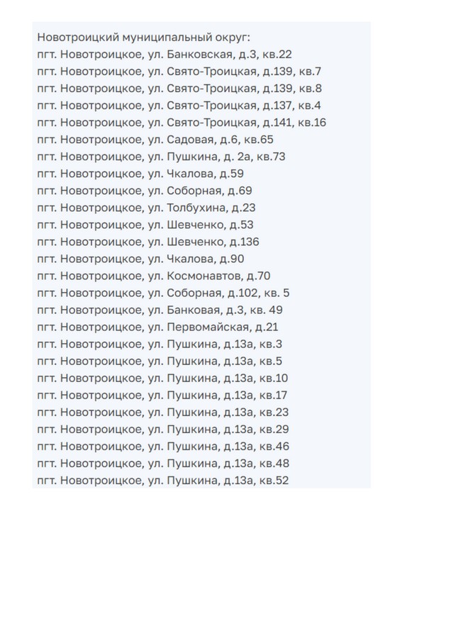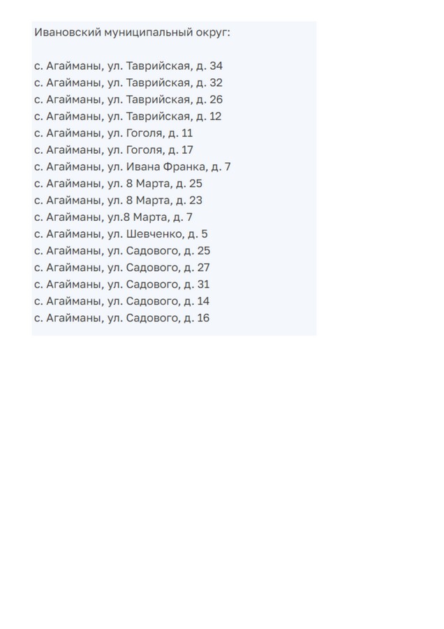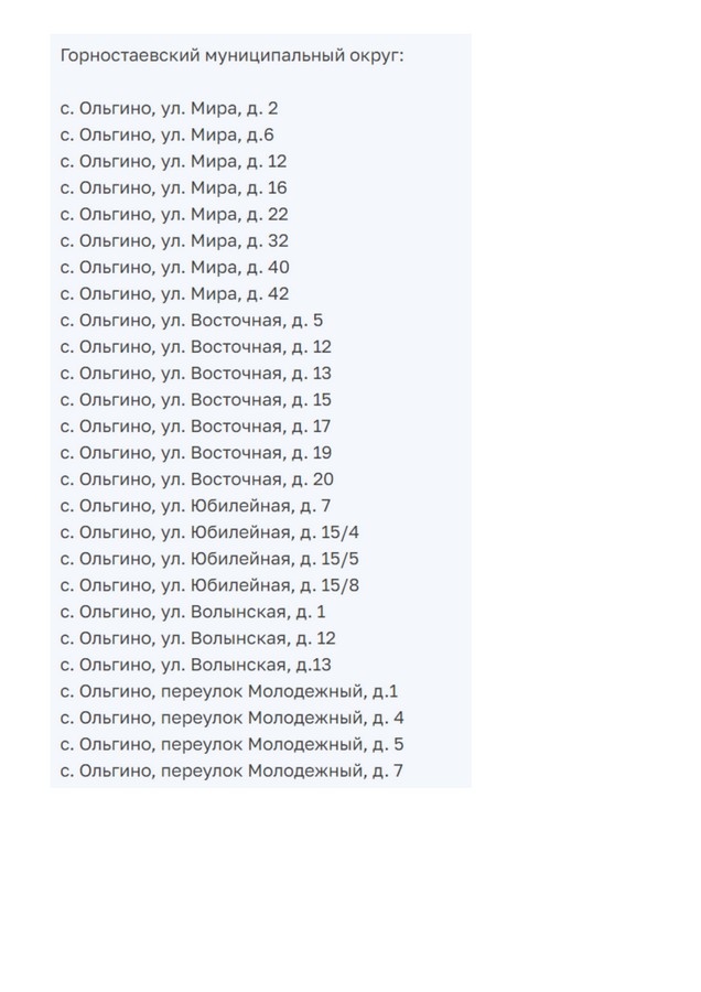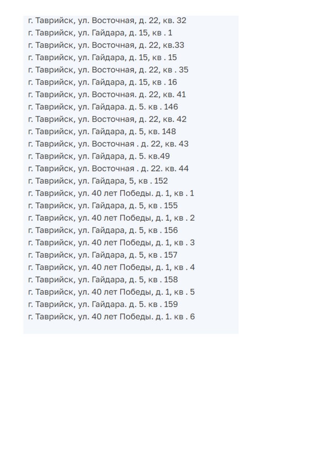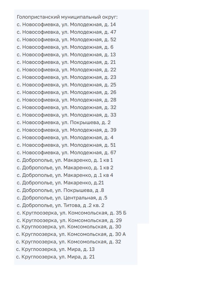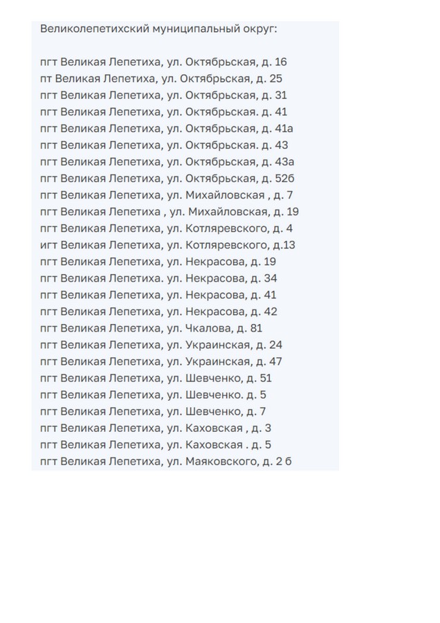 У списках вказані адреси в населених пунктах Каховського району: м. Таврійськ, селищах Дніпряни і Райське, селі Обривка Новокаховської громади, с. Ольгине Горностаївської громади, селищі Велика Лепетиха, с. Рубанівка, с. Григорівка Присиваської громади, селищі Чаплинка, м. Каховка, с. Тавричанка однойменної громади, селищі Верхній Рогачик.