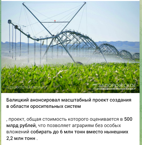 Гауляйтер Запорізької області Євгеній Балицький майже відразу після теракту росіян на Каховській ГЕС заявив, що на ТОТ Запорізької області буде реалізований «масштабний проєкт створення зрошувальних систем» загальною вартістю 500 мільярдів рублів. Паралельно окупанти повідомляють про вражаючі «успіхи» у сільському господарстві та вихід аграрної сфери регіону на «принципово новий рівень».