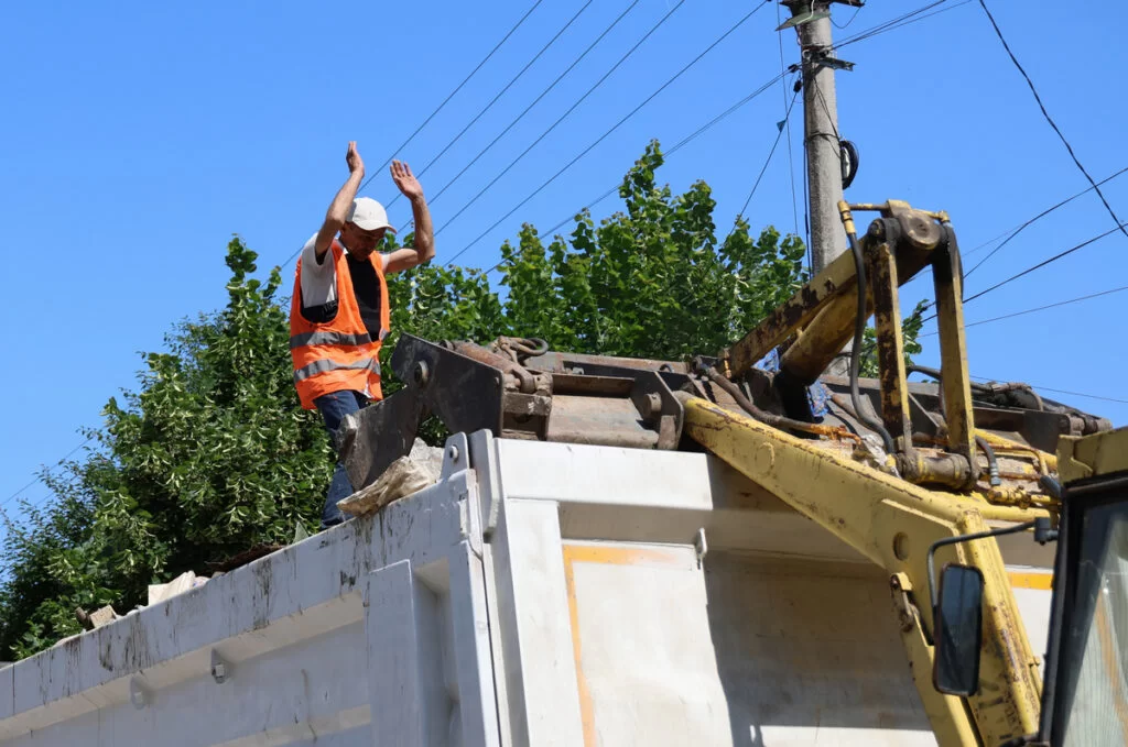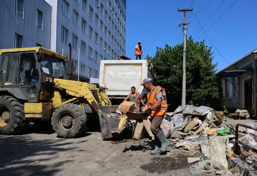 Комунальні служби Херсона вивозять одяг, меблі та інші побутові речі, які люди повикидали після підтоплення.Фото – Іван Антипенко