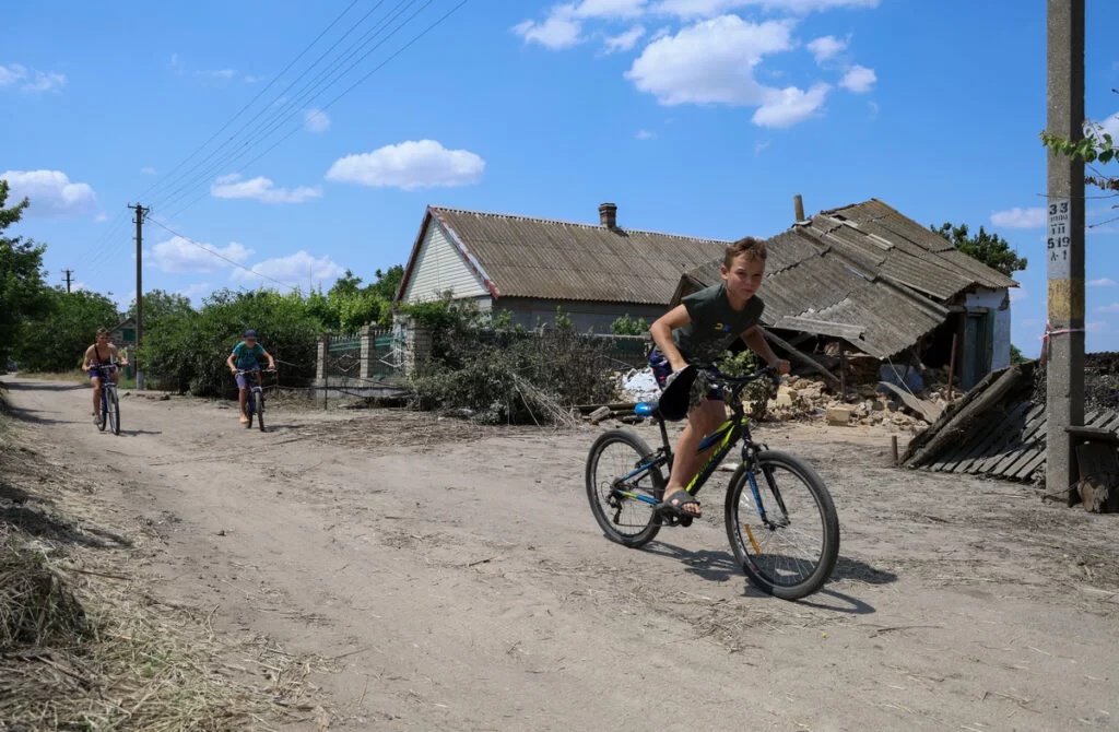 Діти катаються на велосипедах вулицями села Федорівка, які ще кілька днів стояли у воді. Червень 2023 р.Фото – Іван Антипенко