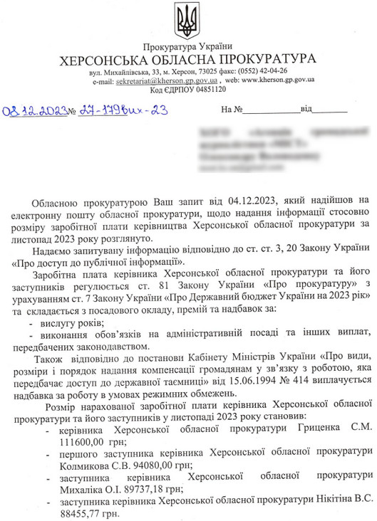 Керівники Херсонської обласної прокуратури за листопад заробили більше 385 тисяч гривень