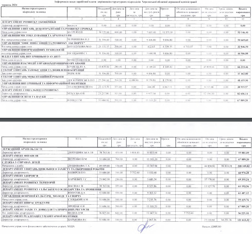 Виконуюча обов’язки директора департаменту захисту довкілля та природніх ресурсів Ользі Філіній виплатили 56 тисяч 225 гривень та 10 копійок. А директорка департаменту реалізації гуманітарної політики Віолетта Царькова заробила 131 тисячу 613 гривень і 32 копійки.