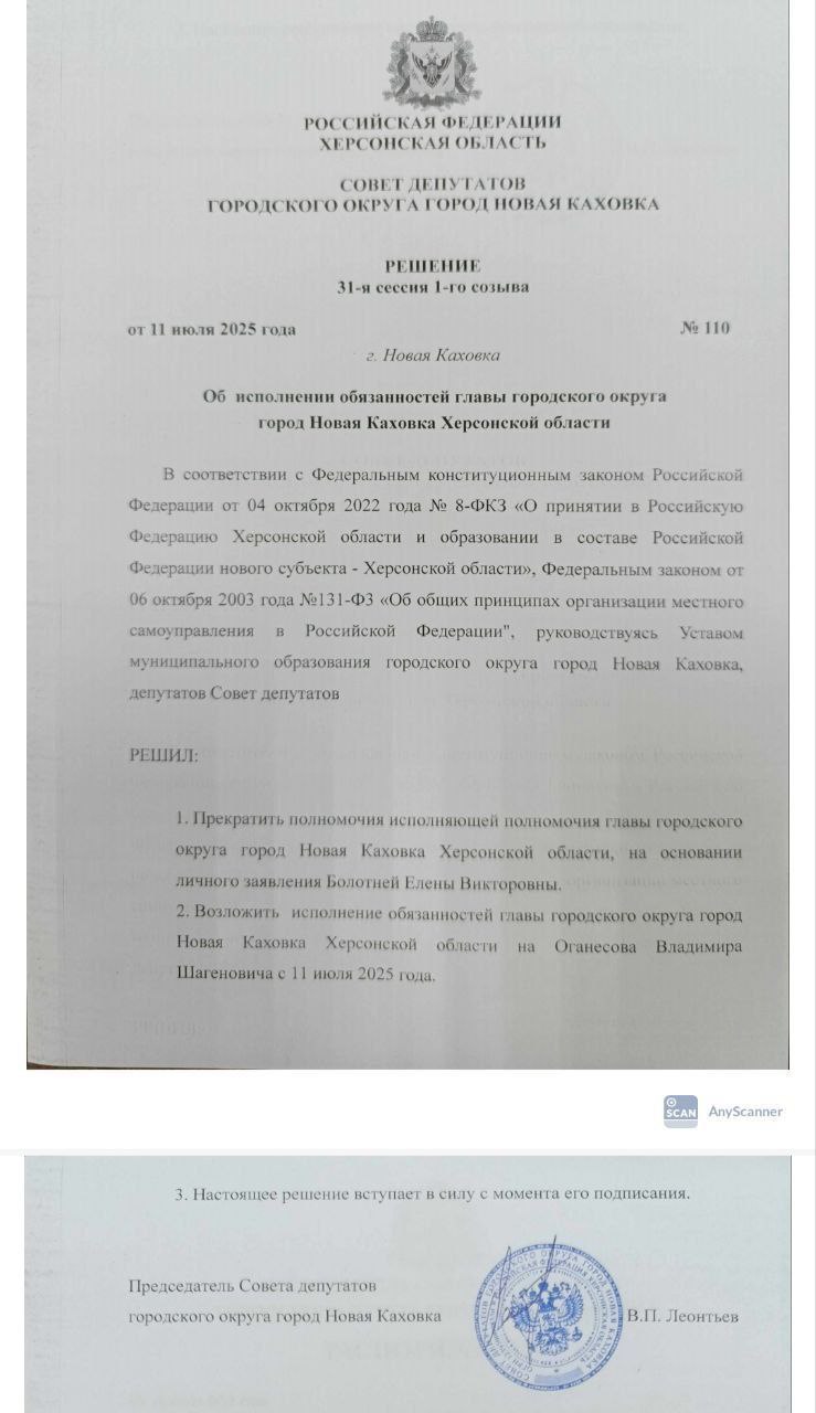 Виконуючим обов’язки окупаційного голови його призначили на «позачерговій 31 сесії ради депутатів міського округу Нова Каховка».