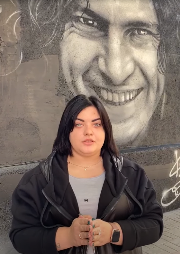 Євгенія Рубін біля муралу зі зображенням Кузьми Скрябина у Херсоні, осінь 2020 року. Фото: скріншот відео