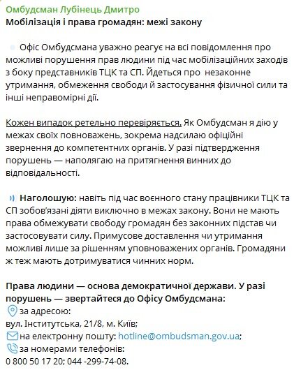 "Наголошую: навіть під час воєнного стану працівники ТЦК і СП зобов’язані діяти виключно в рамках закону. Вони не мають права обмежувати свободу громадян без законних підстав або застосовувати силу", – заявив омбудсмен.