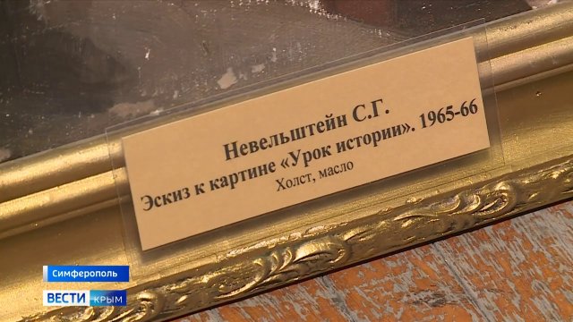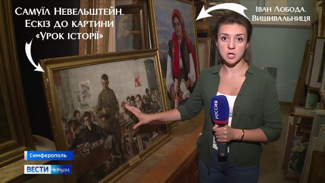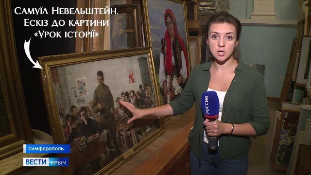 У сюжеті фейкових новин, відзнятих російськими пропагандистами в Центральному музеї Тавриди у вересні 2023 року, оператор найбільше уваги приділив вкраденому з Херсонського художнього музею ескізу до картини Самуїла Невельштейна (1903-1983) «Урок історії» – повідомляють на своїй фейсбук-сторінці музейники Херсона.