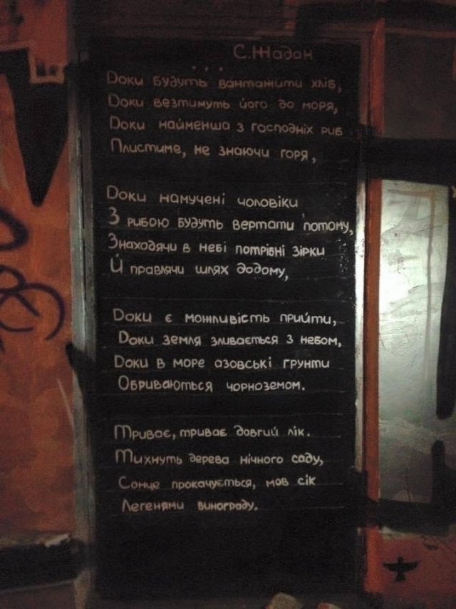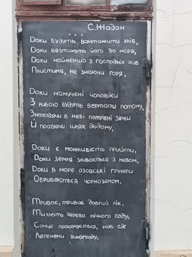 На одній із центральних вулиць Херсона — місцеві знають, де саме — культурні діячі ще 2016 року написали вірш Сергія Жадана на дверях, які виходять на вулицю. Цей вірш пережив окупацію та переживає жахливі обстріли Херсона.«На кораблі вантажать зерно.