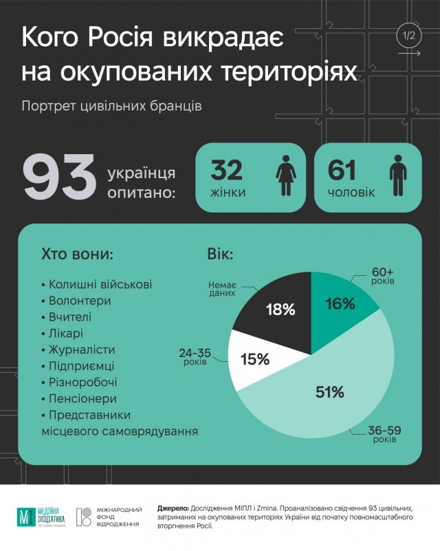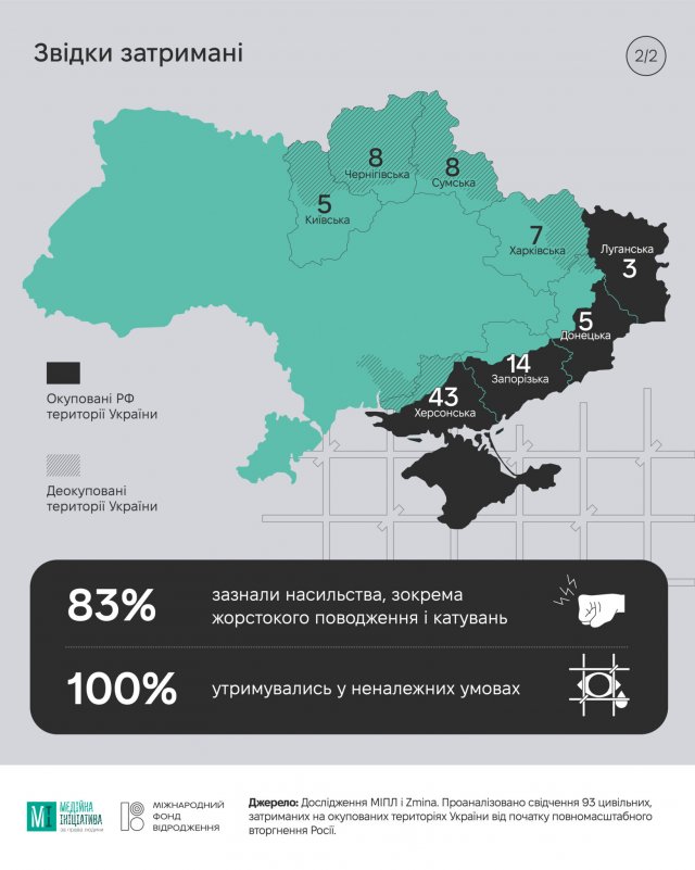 Медійна ініціатива за права людини і Центр прав людини Zmina проаналізували свідчення 93 цивільних українців, яких росіяни затримали під час окупації територій України, але згодом звільнили.Період утримання опитаних коливається від кількох годин до кількох місяців. Однак усіх їх тримали у неналежних умовах, а понад 80% зазнали насилля. Переслідували і викрадали людей з усіх окупованих областей. Це українці абсолютно різного віку, статі та професій.